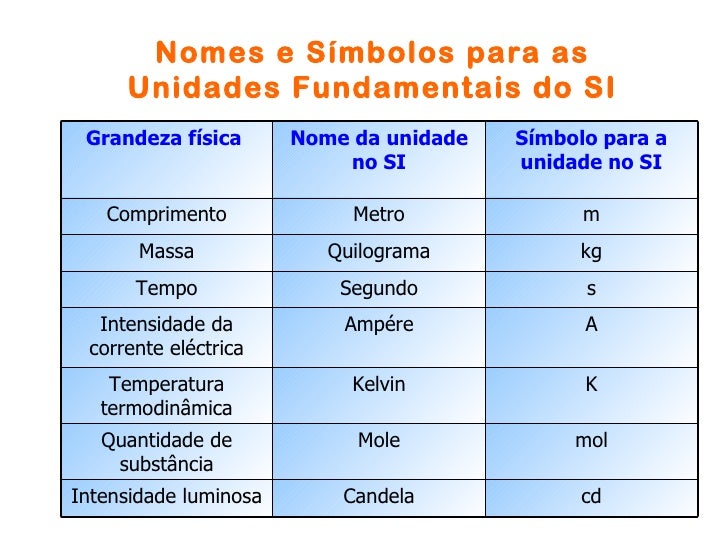 2. 2. Nomes e Símbolos para as Unidades Fundamentais do SI Grandeza física Nome da unidade no SI Símbolo para a unidade no SI Comprimento Metro m Massa Quilograma kg Tempo Segundo s Intensidade da corrente eléctrica Ampére A Temperatura termodinâmica Kelvin K Quantidade de substância Mole mol Intensidade luminosa Candela cd