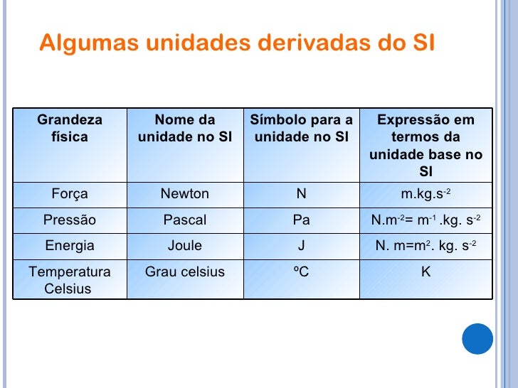 3. 3. Algumas unidades derivadas do SI Grandeza física Nome da unidade no SI Símbolo para a unidade no SI Expressão em termos da unidade base no SI Força Newton N m.kg.s -2 Pressão Pascal Pa N.m -2 = m -1 .kg. s -2 Energia Joule J N. m=m 2 . kg. s -2 Temperatura Celsius Grau celsius ºC K