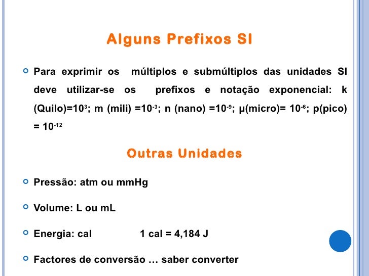 4. 4. Alguns Prefixos SI <ul><li>Para exprimir os múltiplos e submúltiplos das unidades SI deve utilizar-se os prefixos e notação exponencial: k (Quilo)=10 3 ; m (mili) =10 -3 ; n (nano) =10 -9 ; μ (micro)= 10 -6 ; p(pico) = 10 -12 </li></ul><ul><li>Outras Unidades </li></ul><ul><li>Pressão: atm ou mmHg </li></ul><ul><li>Volume: L ou mL </li></ul><ul><li>Energia: cal 1 cal = 4,184 J </li></ul><ul><li>Factores de conversão … saber converter </li></ul>