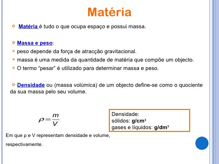 5. 5. Matéria <ul><li>Matéria é tudo o que ocupa espaço e possui massa. </li></ul><ul><li>Massa e peso : </li></ul><ul><li>peso depende da força de atracção gravitacional. </li></ul><ul><li>massa é uma medida da quantidade de matéria que compõe um objecto. </li></ul><ul><li>O termo “pesar” é utilizado para determinar massa e peso. </li></ul><ul><li>Densidade ou (massa volúmica) de um objecto define-se como o quociente da sua massa pelo seu volume. </li></ul>Em que ρ e V representam densidade e volume, respectivamente. Densidade: sólidos: g/cm 3 gases e líquidos: g/dm 3