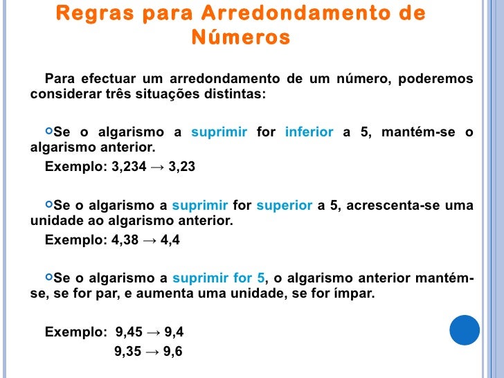 7. 7. Regras para Arredondamento de Números <ul><li>Para efectuar um arredondamento de um número, poderemos considerar três situações distintas: </li></ul><ul><li>Se o algarismo a suprimir for inferior a 5, mantém-se o algarismo anterior. </li></ul><ul><li>Exemplo: 3,234 -> 3,23 </li></ul><ul><li>Se o algarismo a suprimir for superior a 5, acrescenta-se uma unidade ao algarismo anterior. </li></ul><ul><li>Exemplo: 4,38 -> 4,4 </li></ul><ul><li>Se o algarismo a suprimir for 5 , o algarismo anterior mantém-se, se for par, e aumenta uma unidade, se for ímpar. </li></ul><ul><li>Exemplo: 9,45 -> 9,4 </li></ul><ul><li>9,35 -> 9,6 </li></ul>