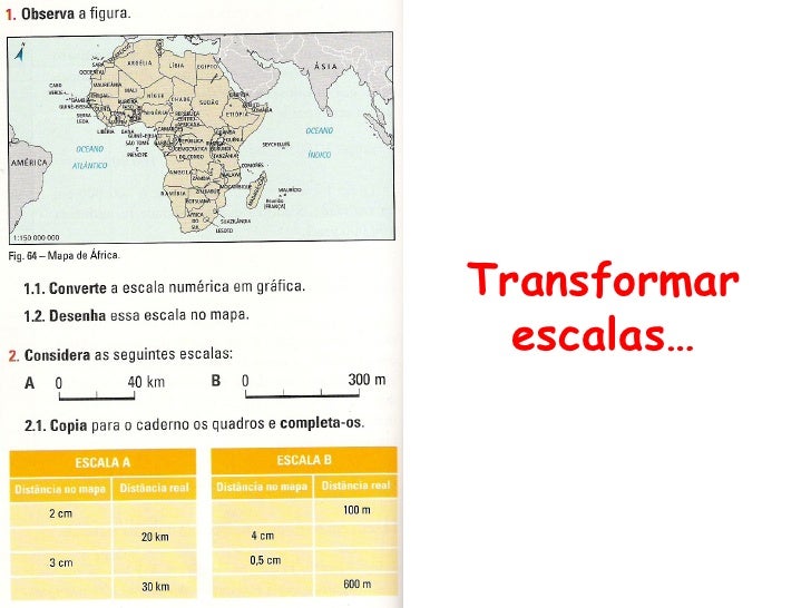 17. 17. 1. Transforma as escalas numéricas seguintes emescalas gráficas. 1/600 000 1/10 000 1/25 000 1/1 000 0002. Copia para o caderno e completa o seguinte quadro. Área Tipo de Escala Pormenor Tipo de Mapa representada Grande Pequena