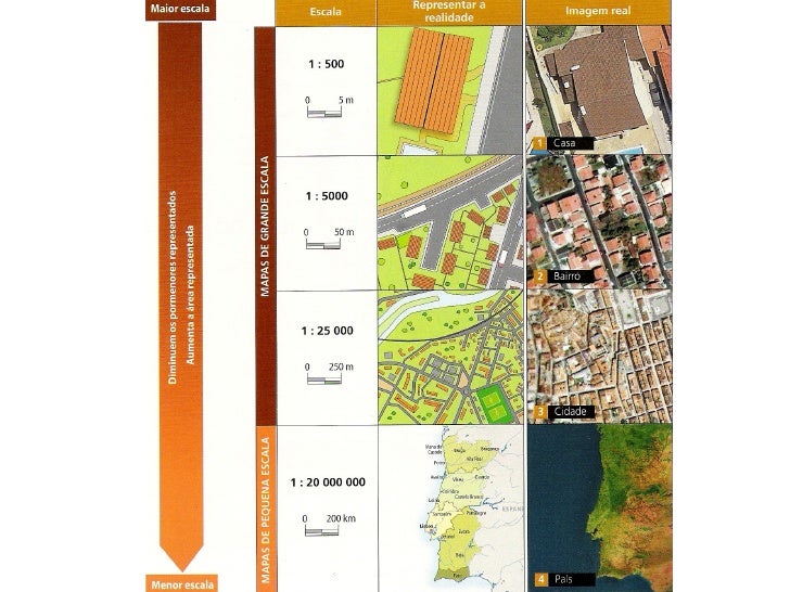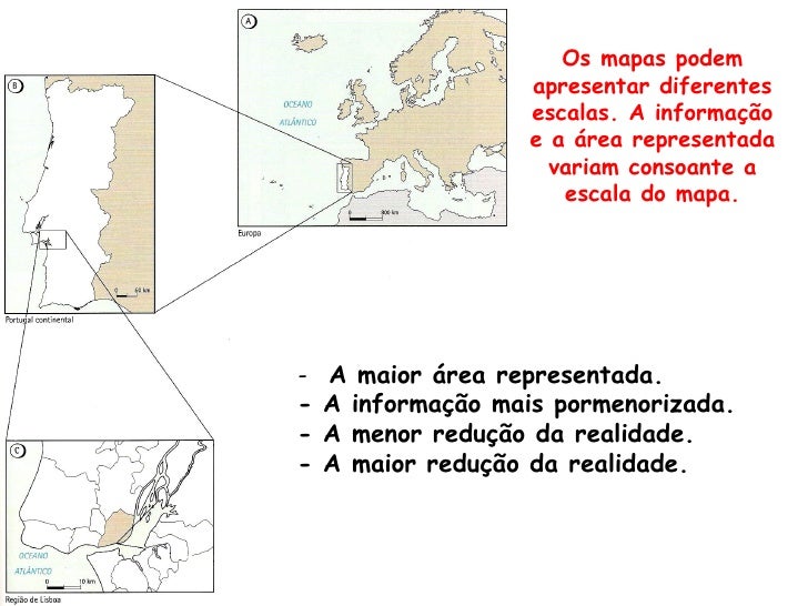 13. 13. Os mapas podem apresentar diferentes escalas. A informação e a área representada variam consoante a escala do mapa.- A maior área representada.- A informação mais pormenorizada.- A menor redução da realidade.- A maior redução da realidade.