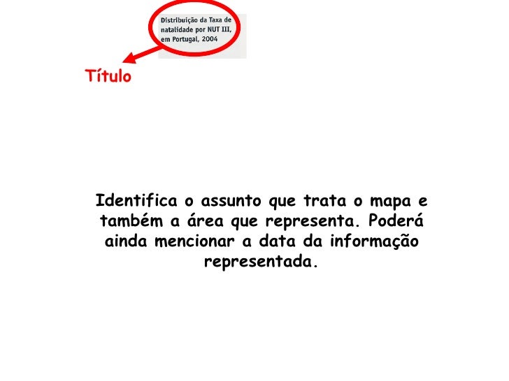 3. 3. Título Identifica o assunto que trata o mapa e também a área que representa. Poderá ainda mencionar a data da informação representada.