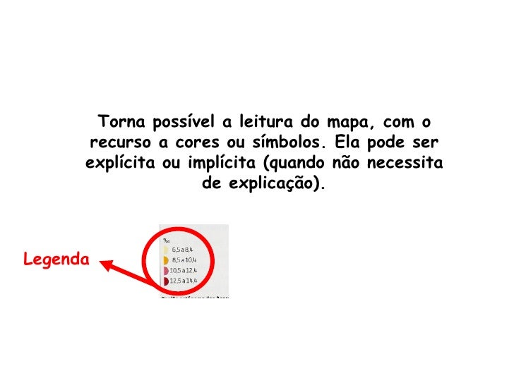 5. 5. Torna possível a leitura do mapa, com o recurso a cores ou símbolos. Ela pode ser explícita ou implícita (quando não necessita de explicação).Legenda