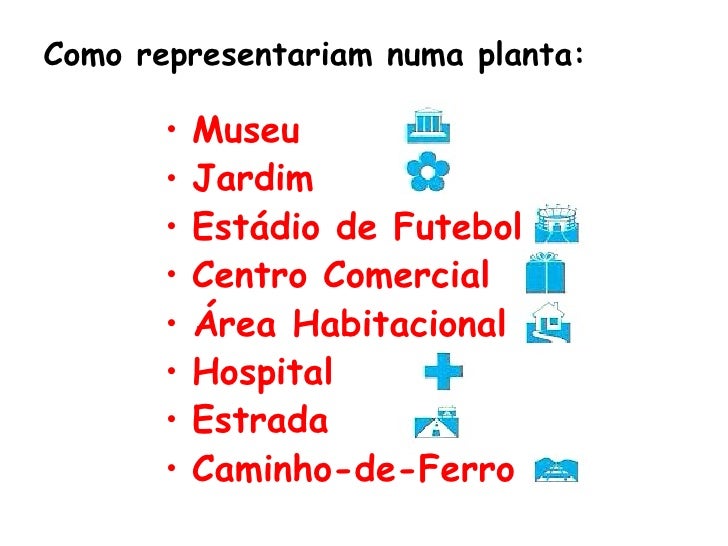 7. 7. Como representariam numa planta: • Museu • Jardim • Estádio de Futebol • Centro Comercial • Área Habitacional • Hospital • Estrada • Caminho-de-Ferro