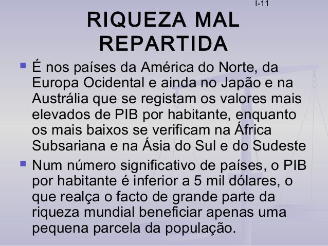 11. 11. I-11 RIQUEZA MAL REPARTIDA  É nos países da América do Norte, da Europa Ocidental e ainda no Japão e na Austrália que se registam os valores mais elevados de PIB por habitante, enquanto os mais baixos se verificam na África Subsariana e na Ásia do Sul e do Sudeste  Num número significativo de países, o PIB por habitante é inferior a 5 mil dólares, o que realça o facto de grande parte da riqueza mundial beneficiar apenas uma pequena parcela da população.