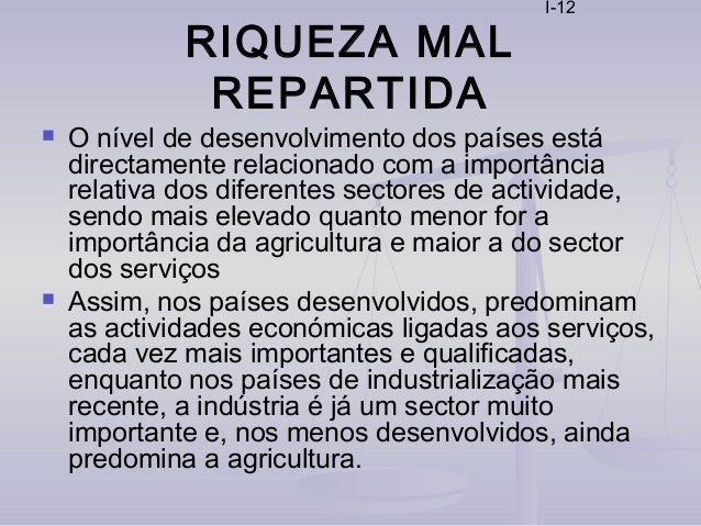 12. 12. I-12 RIQUEZA MAL REPARTIDA  O nível de desenvolvimento dos países está directamente relacionado com a importância relativa dos diferentes sectores de actividade, sendo mais elevado quanto menor for a importância da agricultura e maior a do sector dos serviços  Assim, nos países desenvolvidos, predominam as actividades económicas ligadas aos serviços, cada vez mais importantes e qualificadas, enquanto nos países de industrialização mais recente, a indústria é já um sector muito importante e, nos menos desenvolvidos, ainda predomina a agricultura.