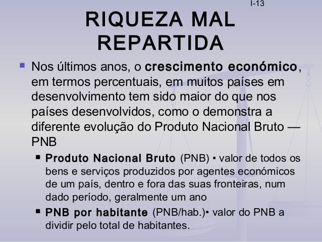 13. 13. I-13 RIQUEZA MAL REPARTIDA  Nos últimos anos, o crescimento económico, em termos percentuais, em muitos países em desenvolvimento tem sido maior do que nos países desenvolvidos, como o demonstra a diferente evolução do Produto Nacional Bruto — PNB  Produto Nacional Bruto (PNB) • valor de todos os bens e serviços produzidos por agentes económicos de um país, dentro e fora das suas fronteiras, num dado período, geralmente um ano  PNB por habitante (PNB/hab.)• valor do PNB a dividir pelo total de habitantes.
