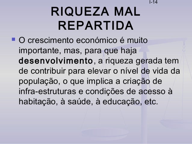 14. 14. I-14 RIQUEZA MAL REPARTIDA  O crescimento económico é muito importante, mas, para que haja desenvolvimento, a riqueza gerada tem de contribuir para elevar o nível de vida da população, o que implica a criação de infra-estruturas e condições de acesso à habitação, à saúde, à educação, etc.