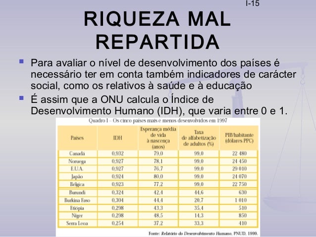 15. 15. I-15 RIQUEZA MAL REPARTIDA  Para avaliar o nível de desenvolvimento dos países é necessário ter em conta também indicadores de carácter social, como os relativos à saúde e à educação  É assim que a ONU calcula o Índice de Desenvolvimento Humano (IDH), que varia entre 0 e 1.