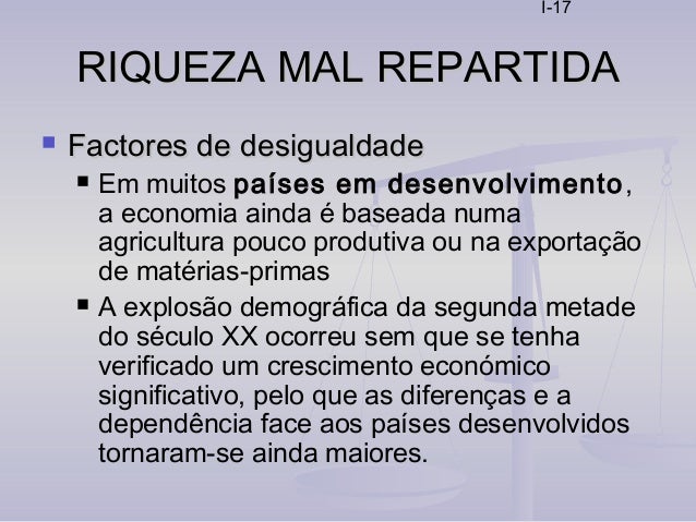 17. 17. I-17 RIQUEZA MAL REPARTIDARIQUEZA MAL REPARTIDA  Factores de desigualdadeFactores de desigualdade  Em muitos países em desenvolvimento, a economia ainda é baseada numa agricultura pouco produtiva ou na exportação de matérias-primas  A explosão demográfica da segunda metade do século XX ocorreu sem que se tenha verificado um crescimento económico significativo, pelo que as diferenças e a dependência face aos países desenvolvidos tornaram-se ainda maiores.