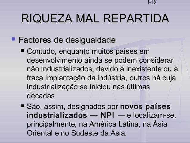 18. 18. I-18 RIQUEZA MAL REPARTIDARIQUEZA MAL REPARTIDA  Factores de desigualdadeFactores de desigualdade  Contudo, enquanto muitos países em desenvolvimento ainda se podem considerar não industrializados, devido à inexistente ou à fraca implantação da indústria, outros há cuja industrialização se iniciou nas últimas décadas  São, assim, designados por novos países industrializados — NPI — e localizam-se, principalmente, na América Latina, na Ásia Oriental e no Sudeste da Ásia.