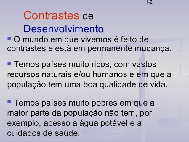 2. 2. I-2  O mundo em que vivemos é feito de contrastes e está em permanente mudança.  Temos países muito ricos, com vastos recursos naturais e/ou humanos e em que a população tem uma boa qualidade de vida. Contrastes de Desenvolvimento  Temos países muito pobres em que a maior parte da população não tem, por exemplo, acesso a água potável e a cuidados de saúde.