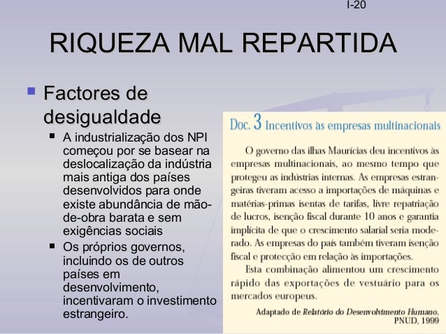 20. 20. I-20 RIQUEZA MAL REPARTIDARIQUEZA MAL REPARTIDA  Factores deFactores de desigualdadedesigualdade  A industrialização dos NPI começou por se basear na deslocalização da indústria mais antiga dos países desenvolvidos para onde existe abundância de mão- de-obra barata e sem exigências sociais  Os próprios governos, incluindo os de outros países em desenvolvimento, incentivaram o investimento estrangeiro.