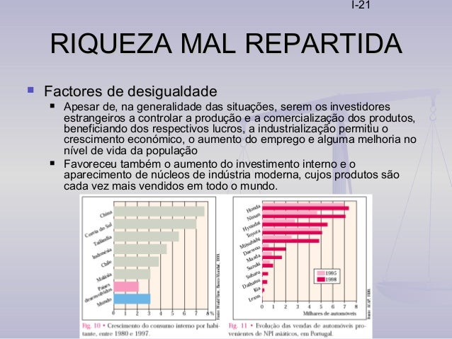 21. 21. I-21 RIQUEZA MAL REPARTIDARIQUEZA MAL REPARTIDA  Factores de desigualdadeFactores de desigualdade  Apesar de, na generalidade das situações, serem os investidores estrangeiros a controlar a produção e a comercialização dos produtos, beneficiando dos respectivos lucros, a industrialização permitiu o crescimento económico, o aumento do emprego e alguma melhoria no nível de vida da população  Favoreceu também o aumento do investimento interno e o aparecimento de núcleos de indústria moderna, cujos produtos são cada vez mais vendidos em todo o mundo.