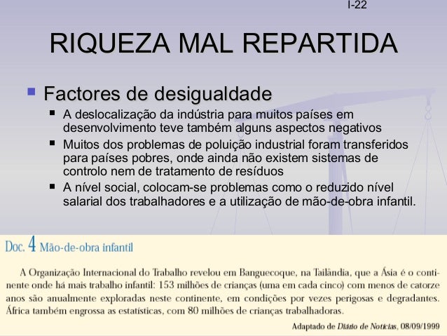 22. 22. I-22 RIQUEZA MAL REPARTIDARIQUEZA MAL REPARTIDA  Factores de desigualdadeFactores de desigualdade  A deslocalização da indústria para muitos países em desenvolvimento teve também alguns aspectos negativos  Muitos dos problemas de poluição industrial foram transferidos para países pobres, onde ainda não existem sistemas de controlo nem de tratamento de resíduos  A nível social, colocam-se problemas como o reduzido nível salarial dos trabalhadores e a utilização de mão-de-obra infantil.
