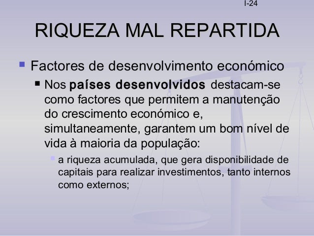 24. 24. I-24 RIQUEZA MAL REPARTIDARIQUEZA MAL REPARTIDA  Factores de desenvolvimento económico  Nos países desenvolvidos destacam-se como factores que permitem a manutenção do crescimento económico e, simultaneamente, garantem um bom nível de vida à maioria da população:  a riqueza acumulada, que gera disponibilidade de capitais para realizar investimentos, tanto internos como externos;
