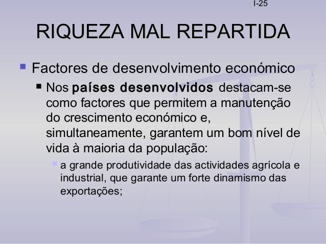 25. 25. I-25 RIQUEZA MAL REPARTIDARIQUEZA MAL REPARTIDA  Factores de desenvolvimento económico  Nos países desenvolvidos destacam-se como factores que permitem a manutenção do crescimento económico e, simultaneamente, garantem um bom nível de vida à maioria da população:  a grande produtividade das actividades agrícola e industrial, que garante um forte dinamismo das exportações;
