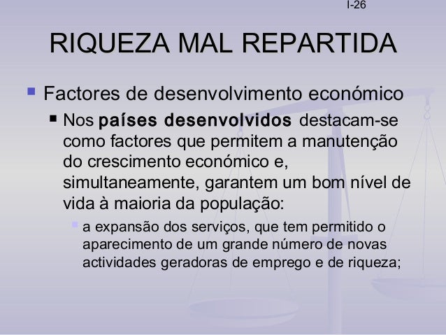 26. 26. I-26 RIQUEZA MAL REPARTIDARIQUEZA MAL REPARTIDA  Factores de desenvolvimento económico  Nos países desenvolvidos destacam-se como factores que permitem a manutenção do crescimento económico e, simultaneamente, garantem um bom nível de vida à maioria da população:  a expansão dos serviços, que tem permitido o aparecimento de um grande número de novas actividades geradoras de emprego e de riqueza;