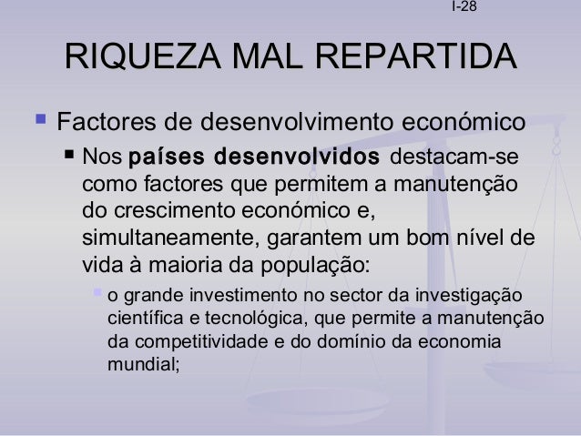 28. 28. I-28 RIQUEZA MAL REPARTIDARIQUEZA MAL REPARTIDA  Factores de desenvolvimento económico  Nos países desenvolvidos destacam-se como factores que permitem a manutenção do crescimento económico e, simultaneamente, garantem um bom nível de vida à maioria da população:  o grande investimento no sector da investigação científica e tecnológica, que permite a manutenção da competitividade e do domínio da economia mundial;