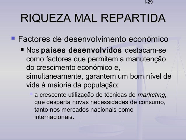 29. 29. I-29 RIQUEZA MAL REPARTIDARIQUEZA MAL REPARTIDA  Factores de desenvolvimento económico  Nos países desenvolvidos destacam-se como factores que permitem a manutenção do crescimento económico e, simultaneamente, garantem um bom nível de vida à maioria da população:  a crescente utilização de técnicas de marketing, que desperta novas necessidades de consumo, tanto nos mercados nacionais como internacionais.