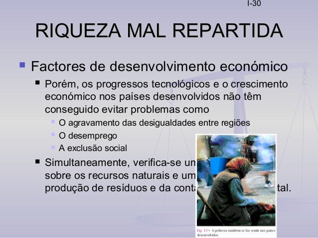 30. 30. I-30 RIQUEZA MAL REPARTIDARIQUEZA MAL REPARTIDA  Factores de desenvolvimento económico  Porém, os progressos tecnológicos e o crescimento económico nos países desenvolvidos não têm conseguido evitar problemas como  O agravamento das desigualdades entre regiões  O desemprego  A exclusão social  Simultaneamente, verifica-se uma maior pressão sobre os recursos naturais e um aumento da produção de resíduos e da contaminação ambiental.