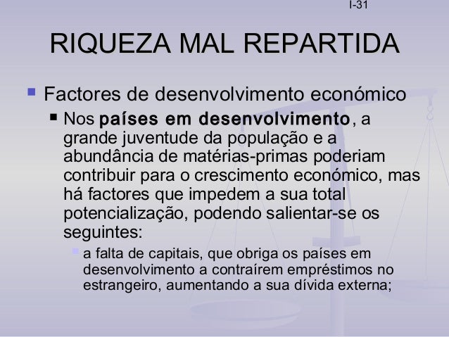 31. 31. I-31 RIQUEZA MAL REPARTIDARIQUEZA MAL REPARTIDA  Factores de desenvolvimento económico  Nos países em desenvolvimento, a grande juventude da população e a abundância de matérias-primas poderiam contribuir para o crescimento económico, mas há factores que impedem a sua total potencialização, podendo salientar-se os seguintes:  a falta de capitais, que obriga os países em desenvolvimento a contraírem empréstimos no estrangeiro, aumentando a sua dívida externa;