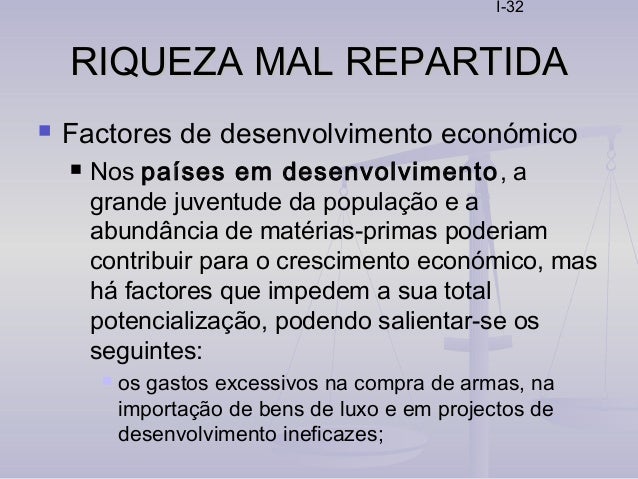 32. 32. I-32 RIQUEZA MAL REPARTIDARIQUEZA MAL REPARTIDA  Factores de desenvolvimento económico  Nos países em desenvolvimento, a grande juventude da população e a abundância de matérias-primas poderiam contribuir para o crescimento económico, mas há factores que impedem a sua total potencialização, podendo salientar-se os seguintes:  os gastos excessivos na compra de armas, na importação de bens de luxo e em projectos de desenvolvimento ineficazes;