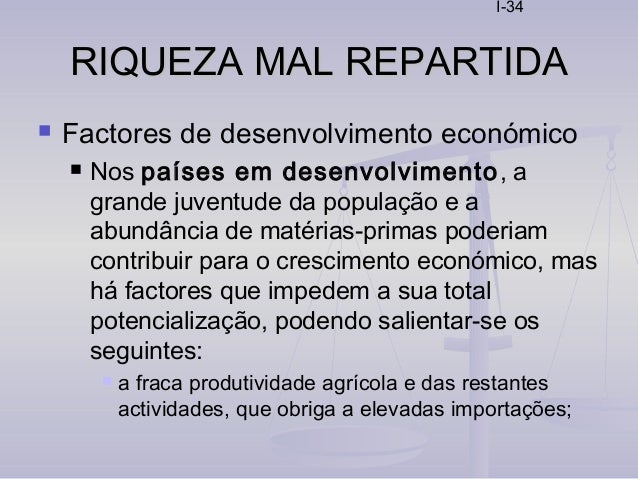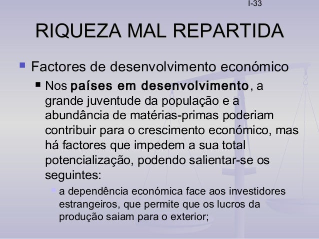 33. 33. I-33 RIQUEZA MAL REPARTIDARIQUEZA MAL REPARTIDA  Factores de desenvolvimento económico  Nos países em desenvolvimento, a grande juventude da população e a abundância de matérias-primas poderiam contribuir para o crescimento económico, mas há factores que impedem a sua total potencialização, podendo salientar-se os seguintes:  a dependência económica face aos investidores estrangeiros, que permite que os lucros da produção saiam para o exterior;
