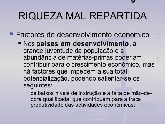 27. 27. I-27 RIQUEZA MAL REPARTIDARIQUEZA MAL REPARTIDA  Factores de desenvolvimento económico  Nos países desenvolvidos destacam-se como factores que permitem a manutenção do crescimento económico e, simultaneamente, garantem um bom nível de vida à maioria da população:  a existência de recursos humanos de elevado nível de instrução e qualificação profissional, que garantem a produtividade e a inovação;