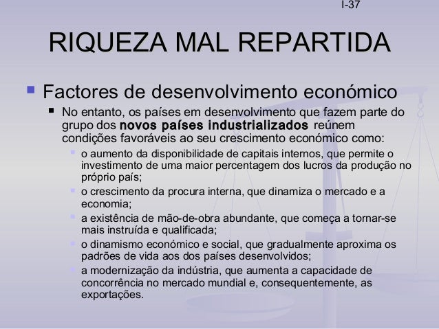 37. 37. I-37 RIQUEZA MAL REPARTIDARIQUEZA MAL REPARTIDA  Factores de desenvolvimento económico  No entanto, os países em desenvolvimento que fazem parte do grupo dos novos países industrializados reúnem condições favoráveis ao seu crescimento económico como:  o aumento da disponibilidade de capitais internos, que permite o investimento de uma maior percentagem dos lucros da produção no próprio país;  o crescimento da procura interna, que dinamiza o mercado e a economia;  a existência de mão-de-obra abundante, que começa a tornar-se mais instruída e qualificada;  o dinamismo económico e social, que gradualmente aproxima os padrões de vida aos dos países desenvolvidos;  a modernização da indústria, que aumenta a capacidade de concorrência no mercado mundial e, consequentemente, as exportações.