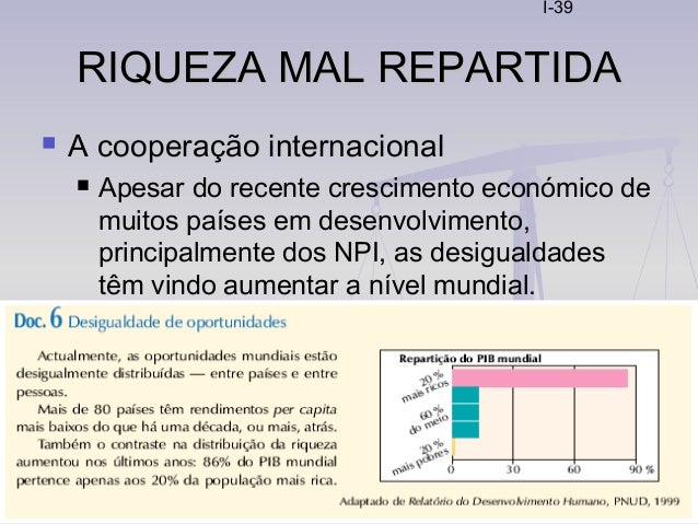 39. 39. I-39 RIQUEZA MAL REPARTIDARIQUEZA MAL REPARTIDA  A cooperação internacional  Apesar do recente crescimento económico de muitos países em desenvolvimento, principalmente dos NPI, as desigualdades têm vindo aumentar a nível mundial.