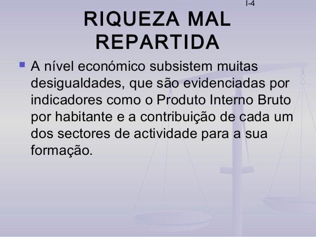 4. 4. I-4 RIQUEZA MAL REPARTIDA  A nível económico subsistem muitas desigualdades, que são evidenciadas por indicadores como o Produto Interno Bruto por habitante e a contribuição de cada um dos sectores de actividade para a sua formação.