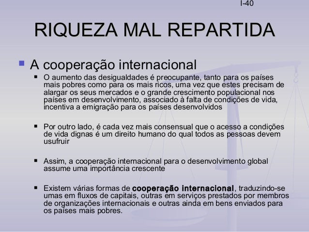 40. 40. I-40 RIQUEZA MAL REPARTIDARIQUEZA MAL REPARTIDA  A cooperação internacional  O aumento das desigualdades é preocupante, tanto para os países mais pobres como para os mais ricos, uma vez que estes precisam de alargar os seus mercados e o grande crescimento populacional nos países em desenvolvimento, associado à falta de condições de vida, incentiva a emigração para os países desenvolvidos  Por outro lado, é cada vez mais consensual que o acesso a condições de vida dignas é um direito humano do qual todos as pessoas devem usufruir  Assim, a cooperação internacional para o desenvolvimento global assume uma importância crescente  Existem várias formas de cooperação internacional, traduzindo-se umas em fluxos de capitais, outras em serviços prestados por membros de organizações internacionais e outras ainda em bens enviados para os países mais pobres.