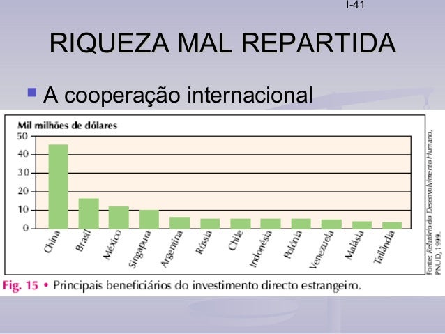 41. 41. I-41 RIQUEZA MAL REPARTIDARIQUEZA MAL REPARTIDA  A cooperação internacional  O investimento estrangeiro  Nos países em desenvolvimento, o investimento estrangeiro gera emprego e, ao mesmo tempo, promove o progresso tecnológico e potencia o desenvolvimento social, uma vez que indirectamente, favorece a elevação dos níveis de instrução e de qualificação profissional  Todavia, também tem inconvenientes como a sobreexploração dos recursos naturais, o envio de grande parte dos lucros para os países desenvolvidos e o aumento da dependência dos países em desenvolvimento  Entre os maiores beneficiários do investimento estrangeiro encontram-se alguns NPI, onde o baixo custo da mão-de-obra e os benefícios concedidos às empresas multinacionais proporcionam elevados lucros aos investidores.
