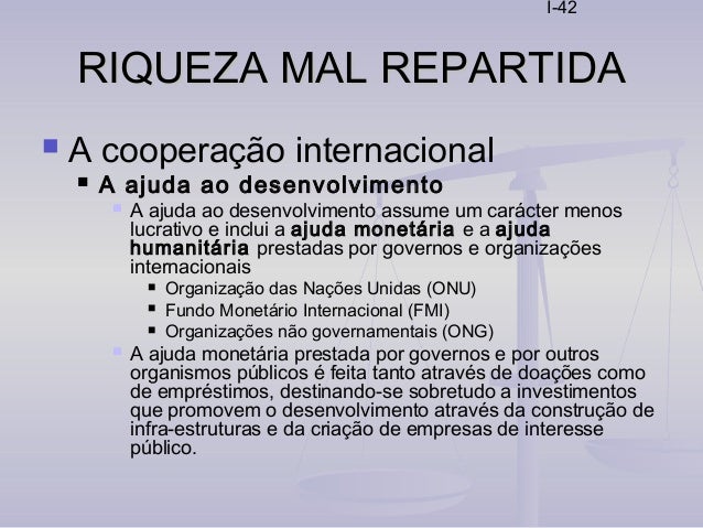 42. 42. I-42 RIQUEZA MAL REPARTIDARIQUEZA MAL REPARTIDA  A cooperação internacional  A ajuda ao desenvolvimento  A ajuda ao desenvolvimento assume um carácter menos lucrativo e inclui a ajuda monetária e a ajuda humanitária prestadas por governos e organizações internacionais  Organização das Nações Unidas (ONU)  Fundo Monetário Internacional (FMI)  Organizações não governamentais (ONG)  A ajuda monetária prestada por governos e por outros organismos públicos é feita tanto através de doações como de empréstimos, destinando-se sobretudo a investimentos que promovem o desenvolvimento através da construção de infra-estruturas e da criação de empresas de interesse público.
