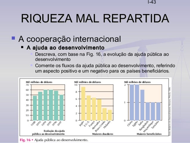 43. 43. I-43 RIQUEZA MAL REPARTIDARIQUEZA MAL REPARTIDA  A cooperação internacional  A ajuda ao desenvolvimento  Descreva, com base na Fig. 16, a evolução da ajuda pública ao desenvolvimento  Comente os fluxos da ajuda pública ao desenvolvimento, referindo um aspecto positivo e um negativo para os países beneficiários.