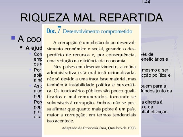 44. 44. I-44 RIQUEZA MAL REPARTIDARIQUEZA MAL REPARTIDA  A cooperação internacional  A ajuda ao desenvolvimento  Contudo, a ajuda monetária, quando é prestada através de empréstimos, aumenta a dívida externa dos países beneficiários e os respectivos juros  Por outro lado, muitas vezes é mal gerida, chegando mesmo a ser aplicada em favor pessoal ou de uma determinada facção política e a não cumprir o seu objectivo inicial (Doc. 7)  As organizações não governamentais também contribuem para a ajuda ao desenvolvimento através da angariação de fundos junto da população dos países desenvolvidos  Porém, a sua acção mais importante passa pela ajuda directa à população carenciada através da distribuição de bens e da prestação de serviços como a assistência médica, a alfabetização, etc.