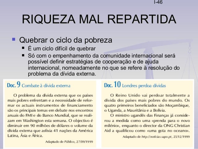 46. 46. I-46 RIQUEZA MAL REPARTIDARIQUEZA MAL REPARTIDA  Quebrar o ciclo da pobreza  É um ciclo difícil de quebrar  Só com o empenhamento da comunidade internacional será possível definir estratégias de cooperação e de ajuda internacional, nomeadamente no que se refere à resolução do problema da dívida externa.