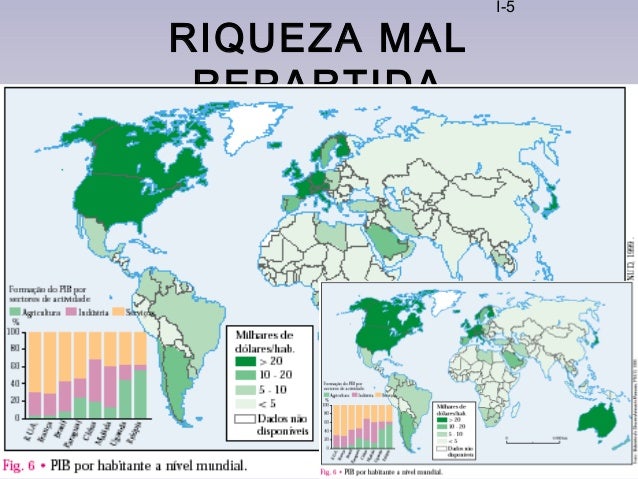 5. 5. I-5 RIQUEZA MAL REPARTIDA  Indique, com base no mapa da Fig. 6, regiões onde o PIB por habitante é:  superior a 20 mil dólares  Norte da América do Norte  Europa Ocidental  Austrália  Japão.