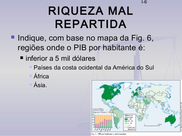 6. 6. I-6 RIQUEZA MAL REPARTIDA  Indique, com base no mapa da Fig. 6, regiões onde o PIB por habitante é:  inferior a 5 mil dólares  Países da costa ocidental da América do Sul  África  Ásia.