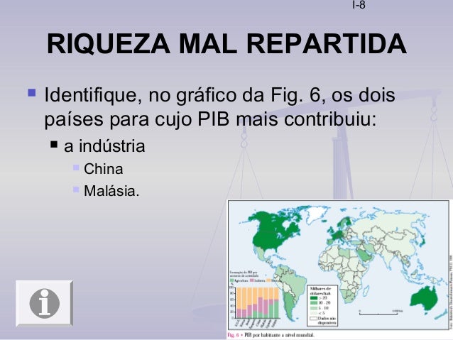 8. 8. I-8 RIQUEZA MAL REPARTIDA  Identifique, no gráfico da Fig. 6, os dois países para cujo PIB mais contribuiu:  a indústria  China  Malásia.