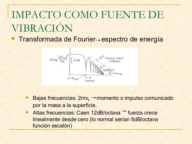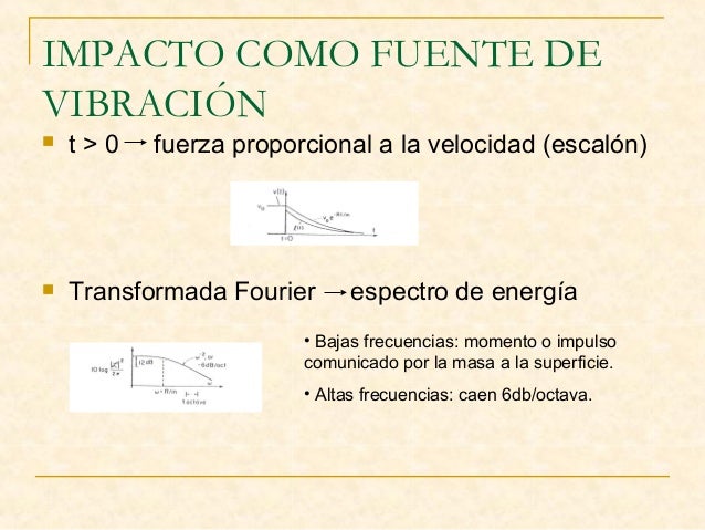 17. 17. IMPACTO COMO FUENTE DE VIBRACIÓN  t > 0 fuerza proporcional a la velocidad (escalón)  Transformada Fourier espectro de energía • Bajas frecuencias: momento o impulso comunicado por la masa a la superficie. • Altas frecuencias: caen 6db/octava.