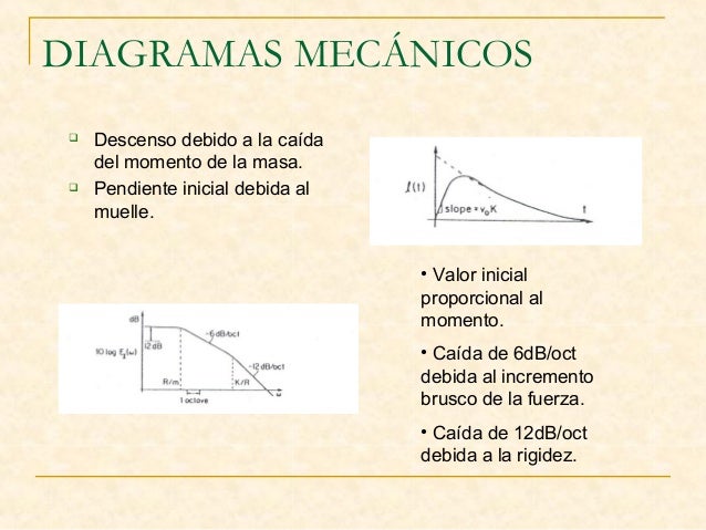 20. 20. DIAGRAMAS MECÁNICOS  Descenso debido a la caída del momento de la masa.  Pendiente inicial debida al muelle. • Valor inicial proporcional al momento. • Caída de 6dB/oct debida al incremento brusco de la fuerza. • Caída de 12dB/oct debida a la rigidez.