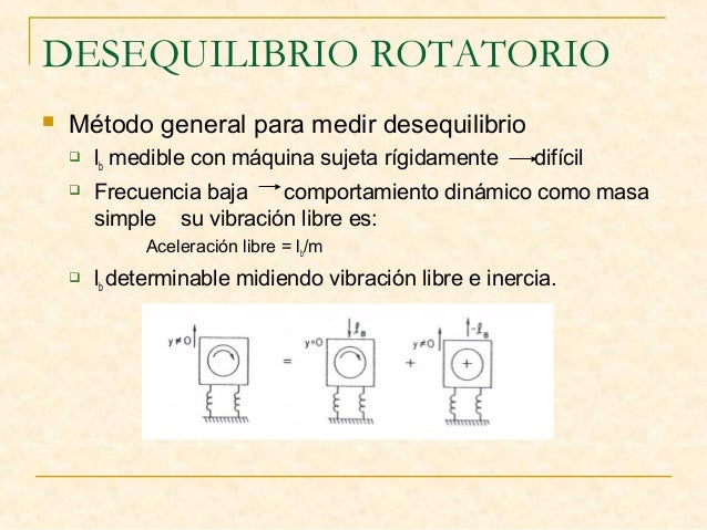 7. 7. DESEQUILIBRIO ROTATORIO  Método general para medir desequilibrio  lb medible con máquina sujeta rígidamente difícil  Frecuencia baja comportamiento dinámico como masa simple su vibración libre es: Aceleración libre = lb/m  lb determinable midiendo vibración libre e inercia.