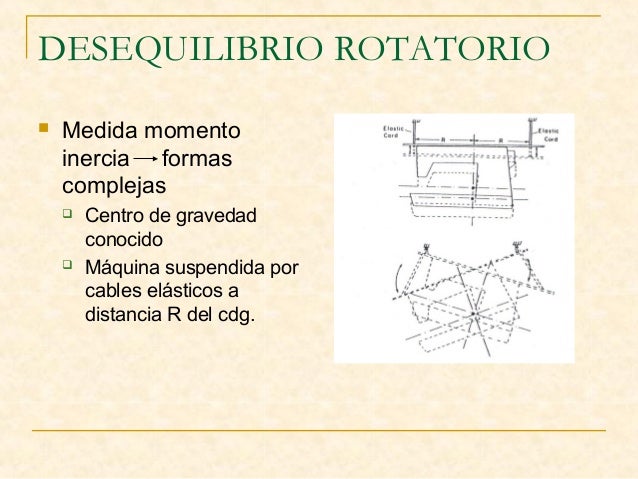 8. 8. DESEQUILIBRIO ROTATORIO  Medida momento inercia formas complejas  Centro de gravedad conocido  Máquina suspendida por cables elásticos a distancia R del cdg.