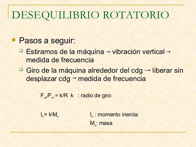 9. 9. DESEQUILIBRIO ROTATORIO  Pasos a seguir:  Estiramos de la máquina vibración vertical medida de frecuencia  Giro de la máquina alrededor del cdg liberar sin desplazar cdg medida de frecuencia Fvert/Frot = k/R k : radio de giro Im = k2 Mm Im : momento inercia Mm: masa