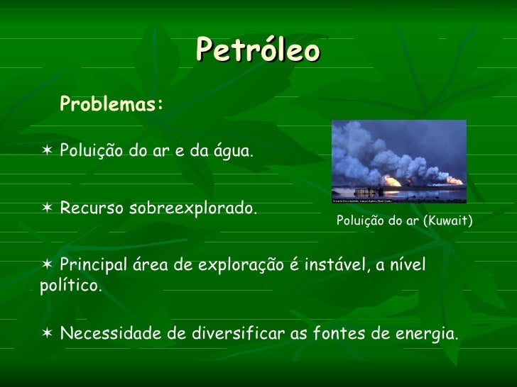 Petróleo  Problemas: Poluição do ar e da água. Recurso sobreexplorado.                                      Poluição do ...