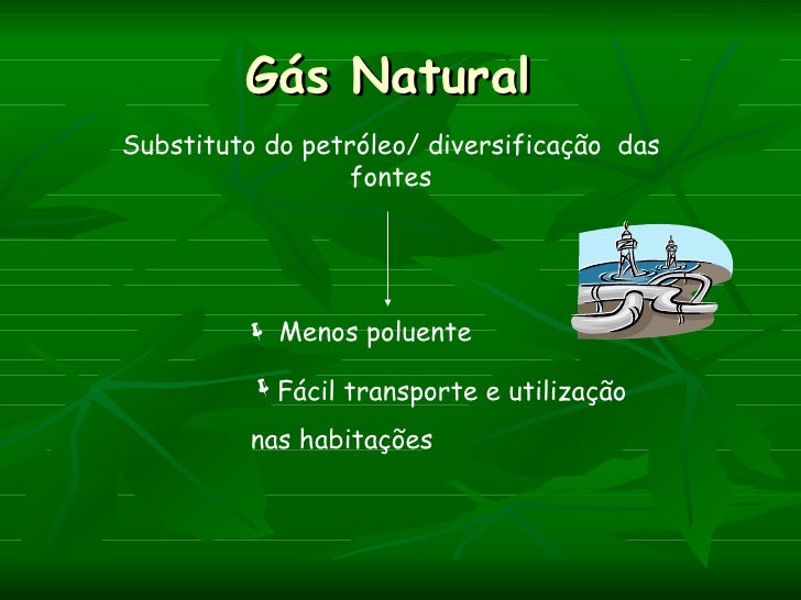 Gás NaturalSubstituto do petróleo/ diversificação das                  fontes          Menos poluente          Fácil tra...
